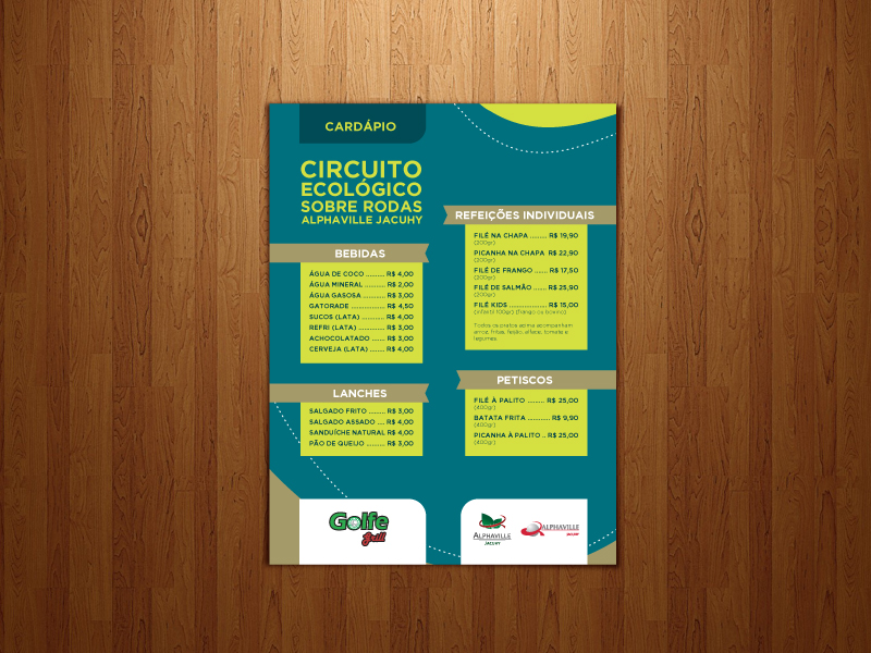 Desenvolvimento de cardápio, bonés, camisas e toalhas para o evento Circuito Ecológico, organizado pela Associação Alphaville Jacuhy (AMAJ) de Serra ES.